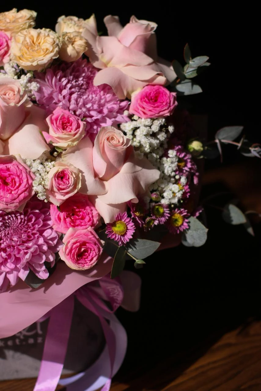букет хризантем и гортензий в коробке